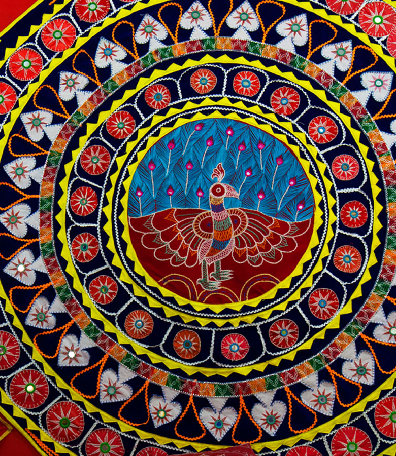 The intricacy of the handicraft, practiced by a specific caste of professional tailors, known as ‘Darjis’, is unparalleled. The technique of creating appliqué is basically cutting up various coloured fabrics which are then sewn on to the surface of another foundation fabric. To accentuate the look, beautiful needlework, sequins and mirrors are added to the design. The stitching varies from one item to another, but is categorised under six styles‘Bakhia’, ‘Taropa’, ‘Ganthi’, ‘Chikana’, Button Hole and ‘Ruching’.The cloth patches are simple and motifs mostly revolve around gods, animals, birds, flowers and plants. The village is home to around 150 craftsmen and there are 500 girls who are involved in needle work, besides the shopkeepers and salesmen who procure the products. Though earlier the art form was restricted to Darji caste, today it is practiced by non-caste members, notably a group of Muslims in the village.